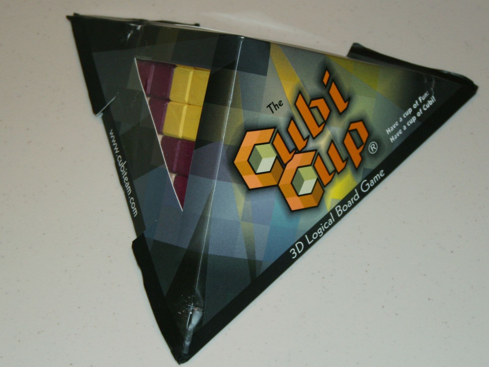 Delta, created by Swiss chess problem composer Erich Brunner, comes with two small boards (one is 5x5 rectangles, the other is 6x6 squares), nine triangular pieces in two colors, and one extra piece in a third color.