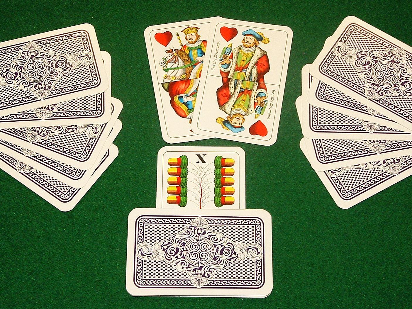 Solitaire for Two plays similarly to Six-Suit Solitaire, but the players take turns drawing tiles from the stock – three at a time – and trying to place them in the layout and score as many tiles as possible. Players score points for each tile they lay off; for playing all three tiles drawn; for moving columns of five, seven, nine or eleven tiles; and for other specialized situations. The player with the highest score wins.