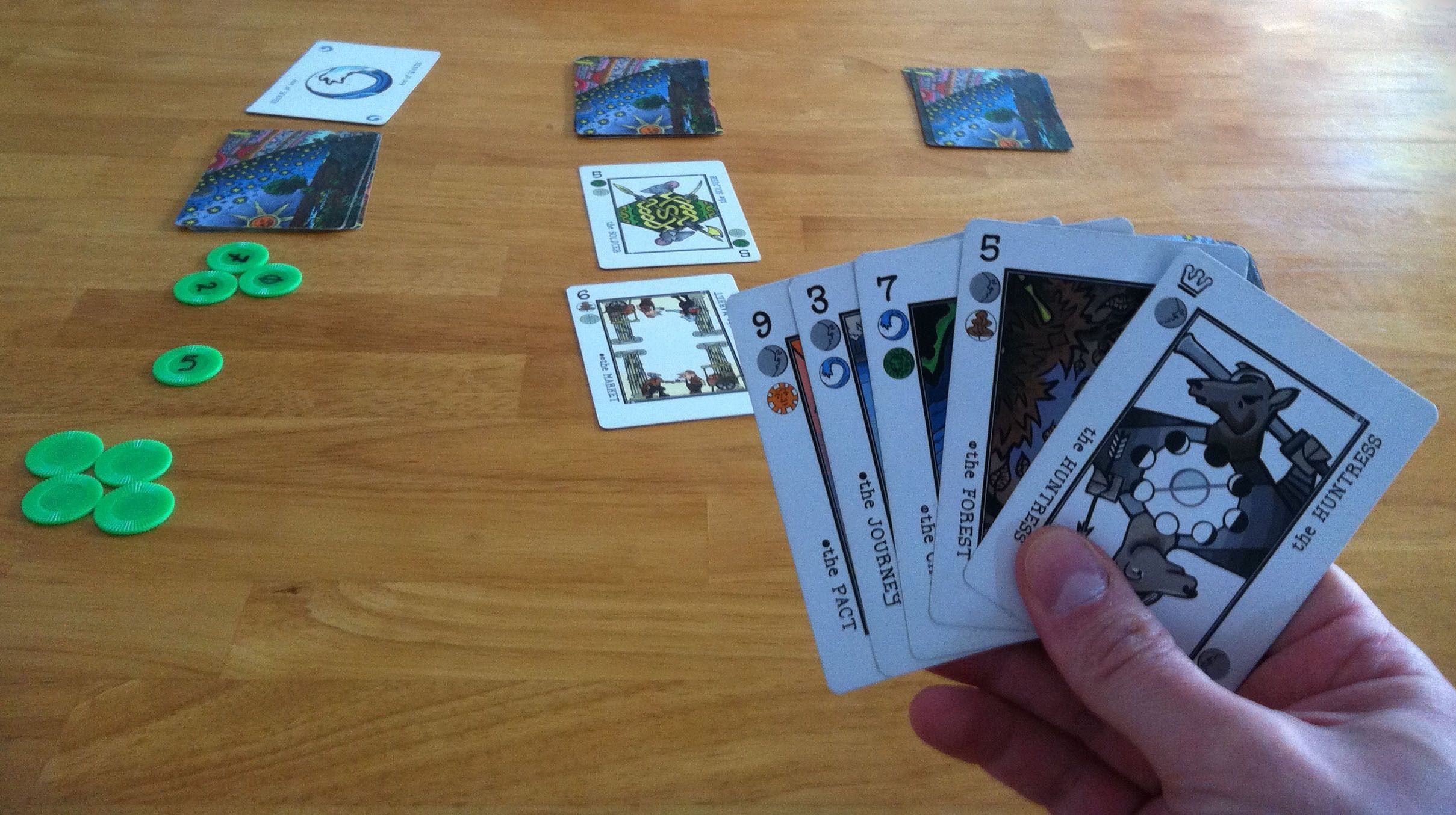 To set up the game, shuffle the 45 cards and lay them out in a 9x5 grid; each player takes a character card. The first player takes a card from the perimeter of the grid, then lays her character card in its place. Each other player in turn order does the same, then play order reverses for the remainder of the collection phase, with players moving their character cards to adjacent spaces (which includes diagonals) to claim cards. Land on an empty space, and you get nothing – but are still active in the round. Once all the cards have been claimed, the round ends.